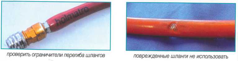 2. Поскольку шланги могут быть легко повреждены (перерезаны, подвергнуты воздействию абразивных предметов, высоких температур, химических растворителей и т.д.), при их использовании следует соблюдать особую осторожность. Ни под каким видом не следует пользоваться поврежденными шлангами, они подлежат немедленной замене.