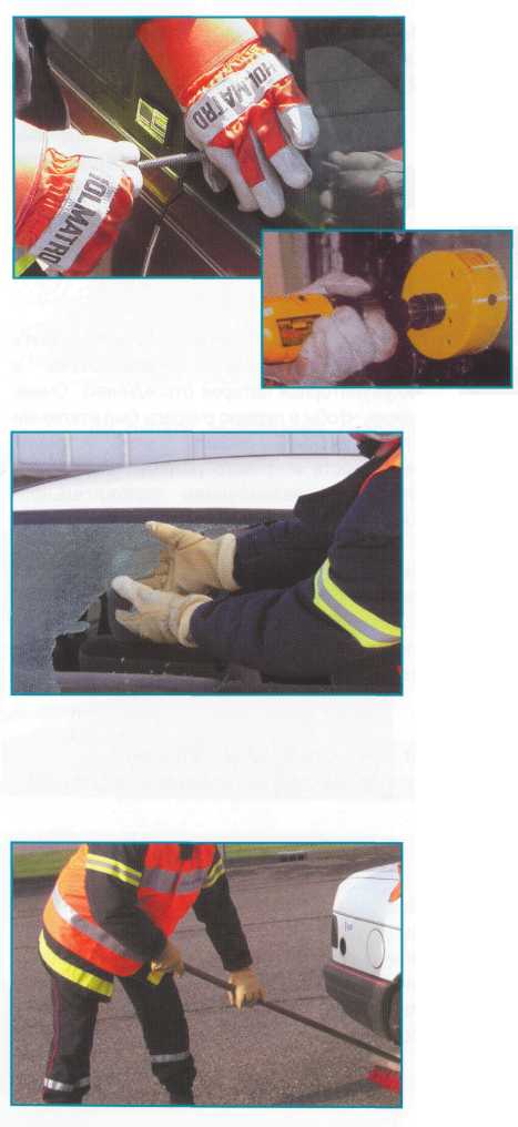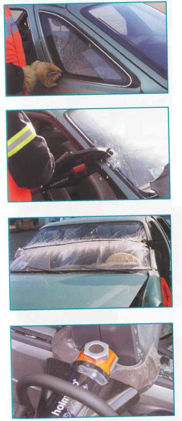 Работу со стеклами всегда следует выполнять в первую очередь, как это было описано в легковых автомобилях, одновременно контролируя возможное срабатывание подушек безопасности. Может оказаться предпочтительным удаление лобового стекла автомобиля при оказании помощи пострадавшему и для облегчения работы спасателей