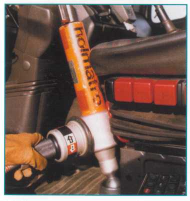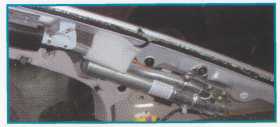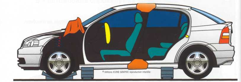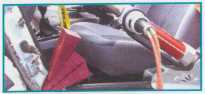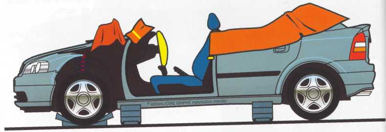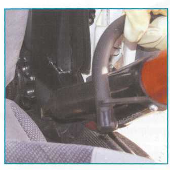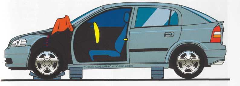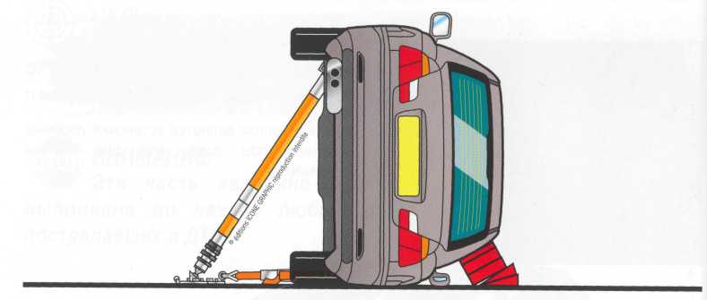 Необходимо надежно зафиксировать положение автомобиля клиньями и блоками, как указывалось ранее. Следует помнить о том, что автомобиль, показанный на рисунках этого раздела, имеет двигатель, расположенный спереди. К автомобилям с задним расположением двигателя должен быть иной подход. Если Вы имеете защитный чехол подушки безопасности установите его сейчас.