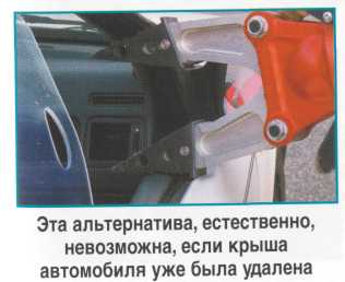 Если Вы намерены откинуть крышу автомобиля вниз, то необходимо предварительно вынуть опорные блоки, установленные под ней. Если это не возможно, продолжайте выполнение работ с опорными элементами на прежних местах, чтобы предотвратить движение крыши вниз.