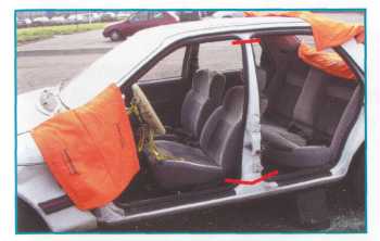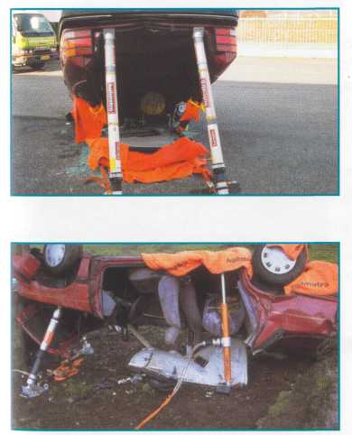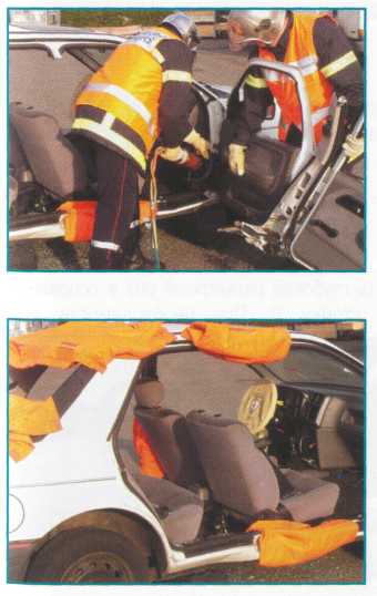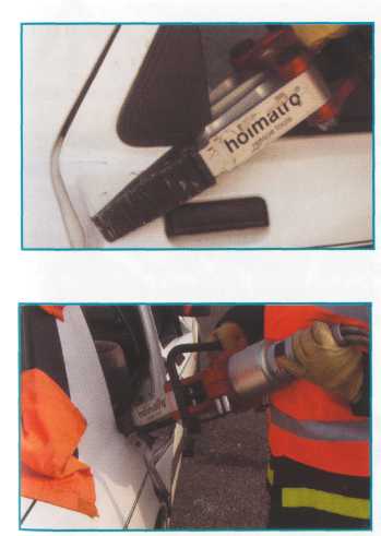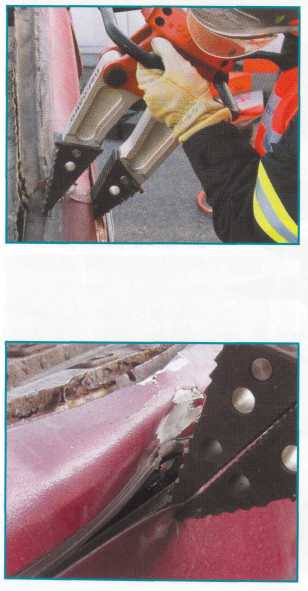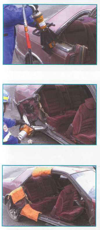 В первую очередь необходимо отрезать опорные стойки В и С, Эту операцию следует выполнять в то время, как другие спасатели поддерживают крышу автомобиля.