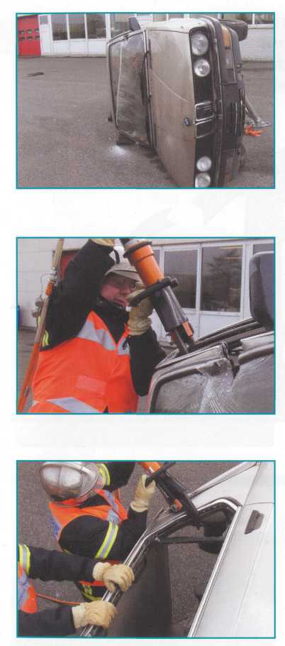 Теперь спасатели могут отогнуть крышу автомобиля вперед. Может быть необходимым использование лома в качестве рычага (оси) для перегиба.