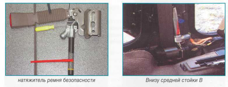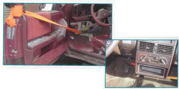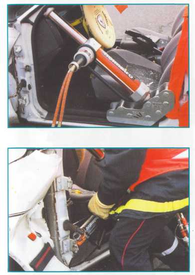 В некоторых ситуациях может также стать возможным отвод педалей от ног пострадавшего в сторону, отогнув их вбок с помощью ремней. Как видно на рисунке, дверь автомобиля может быть использована как рычаг для закрепления ремня.