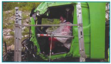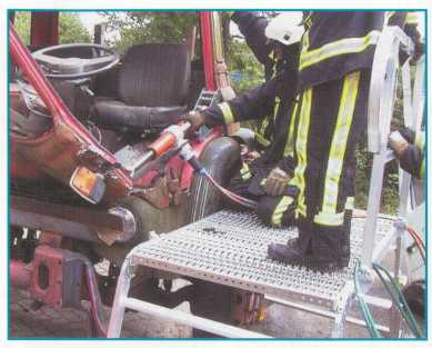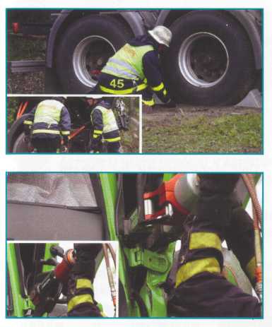 Дополнительную сложность представляет высота кабины грузовиков, что вынуждает спасателей работать на лестницах или платформах. Безопасная работа на платформе требует опыта и четкого взаимопонимания между всеми членами команды. Это будет необходимо при передаче инструментов друг другу и при дальнейшей эвакуации пострадавшего через эту платформу.