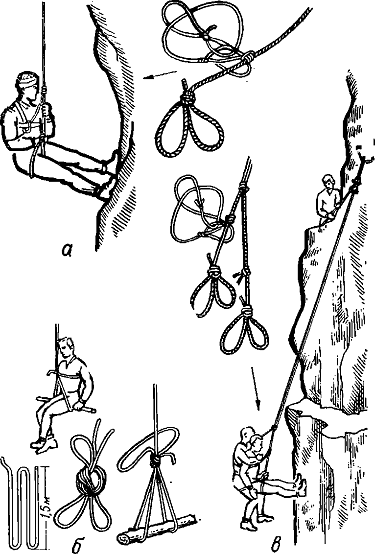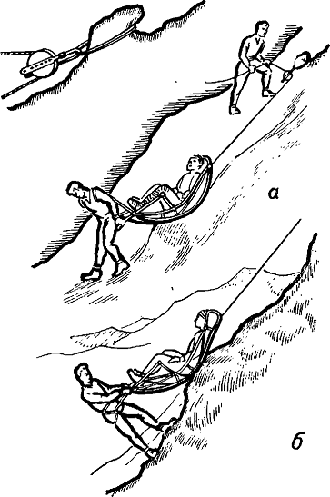 Однако следует иметь в виду, что специальный спасательный инвентарь, как правило, находится на контрольно-спасательных пунктах, в альпинистских лагерях и на туристских базах. Для доставки этого снаряжения к месту несчастного случая требуется иногда значительное время, что может непоправимо задержать спуск пострадавшего.
