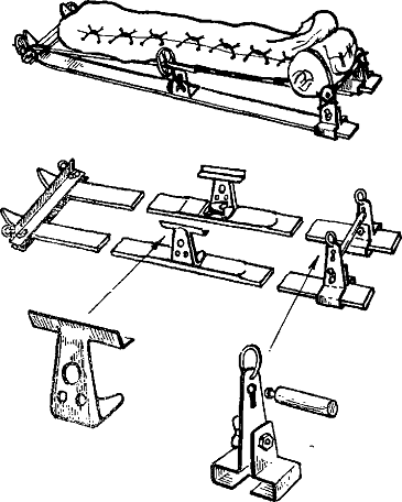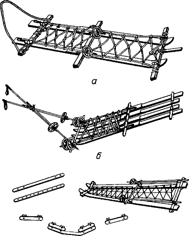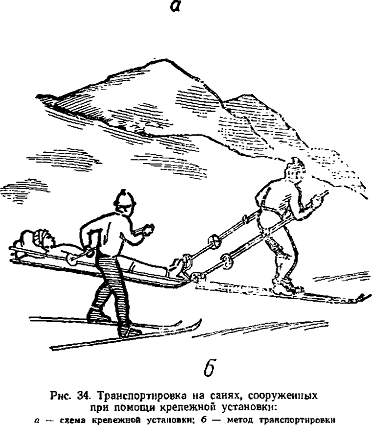 Поэтому, как уже отмечалось, любому альпинисту-разряднику наряду с овладением техникой транспортировки специальным спасательным инвентарем нужно в совершенстве знать приемы транспортировки подручными средствами, то есть имеющимся в группе альпинистским инвентарем.