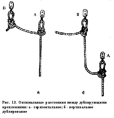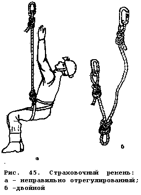 Страховочный конец можно сделать и двойным. Для этой цели используют более длинную веревку около 2.7 м при диаметре 11 мм. После того, как на двух ее концах будут завязаны необходимые узлы, веревка сдваивается узлом "восьмерка" (или "девятка" для диаметра 9 мм), в результате чего получается третий узел (рис. 45б). При этом один конец должен иметь длину 50 см, а другой - не более 75 см, включая карабины. Страховочный конец встегивают в треугольный карабин MR нижней обвязки петлей сдвоенного конца.