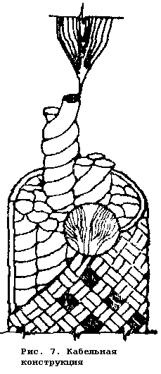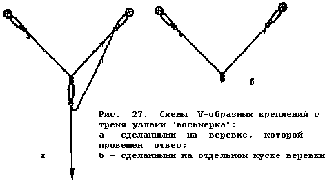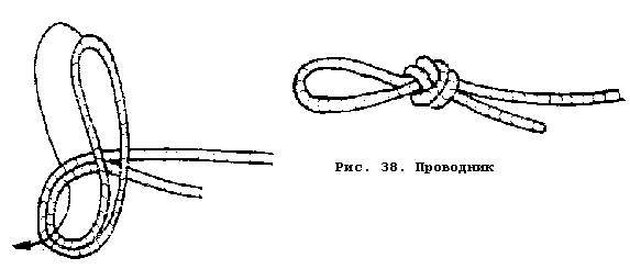 используются в случае, если при разрушении основного крепления динамическая нагрузка на допол-нительное неизбежна. Их применение особенно необходимо как при работе с веревкой d 9 мм, так и с более толстой, но с явными признаками износа. Амортизирующими являются узлы "бабочка" (рис. 34) и проводник (рис. 38).