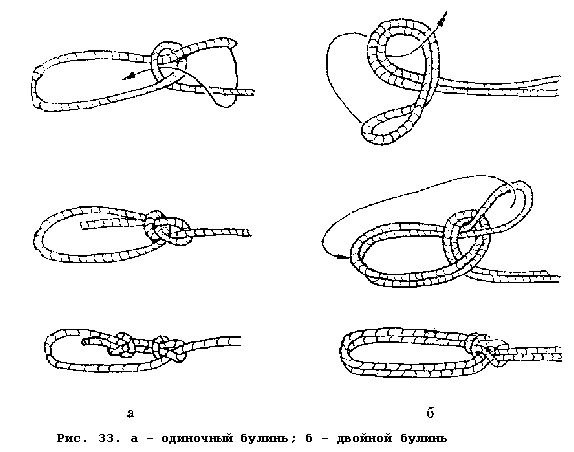 Одинарный и двойной булинь (рис. 33). Прочность двух этих узлов почти одинакова - до 52-53%. После завязывания одинарного булиня со свободным концом обязательно делают контрольный узел.