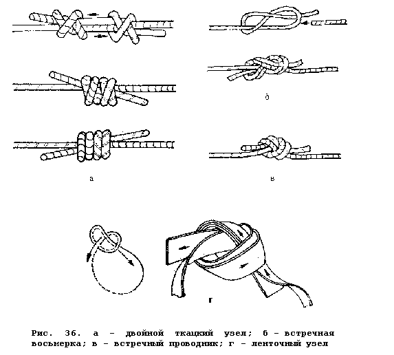Встречный проводник. Ленточный узел (рис. 36 в, г). Применяется для вязания петель из веревки диаметром 9 мм и более и петель из стропы. Петли из ленты вяжутся только этим узлом, отчего он и называется ленточным.