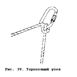 - тормозящий узел (рис. 39). За счет трения в его витках регулируется движение нагруженной веревки при спуске. Используется для спуска в колодец пострадавшего или тяжелого груза.