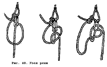 - узел "реми" (рис. 40). Установкой второго карабина в витки тормозя- щего узла последний превращается в автоблокировочный узел "реми". При нехватке самохватов с его помощью можно сделать блок-тормоз для подъ- ема груза или человека.