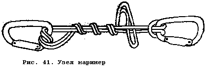 - узел "маринер" (рис. 41). Применяется для устройства оттяжки с петлей и блоком при извлечении пострадавшего или тяжелого груза. Узел "маринер" дает возможность при необходимости развязать и снять петлю, когда отклоняемая веревка нагружена.