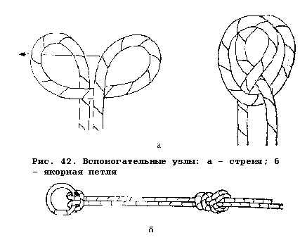 Стремя (рис. 42а). Имеет ограниченное применение в технике одной веревки. Используется для связывания педали с карабином ведущего самохвата (рис. 47), а также если приходится делать дополнительное промежуточное крепление в уже провешенном колодце, если слабины веревки не хватает для завязывания девятки или восьмерки.