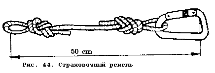 Страховочный "ус" - один из важнейших и специфичных для техники одной веревки приспособлений для самостраховки спелеолога за перила, при перестежке через промежуточные крепления и узлы веревки во время спуска и подъема, при устройстве навески, спасательных работах и т.д. (рис. 44).