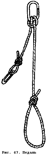 Стремя, с помощью которого осуществляется подъем в колодце, и устройство для страховки спелеолога через ведущий зажим обычно делают из одного куска веревки. Получается приспособление, которое называется педалью (рис. 47). Для изготовления ее используется динамическая веревка диаметром 9 мм и длиной около 3 м. На одном конце одиночным булинем или проводником делается большая петля для двух ног, а на другом - очень короткая петля "восьмеркой". Через узел "стремя", завязанный на карабине ведущего зажима, фиксируется необходимая длина страховочного конца и стремени.