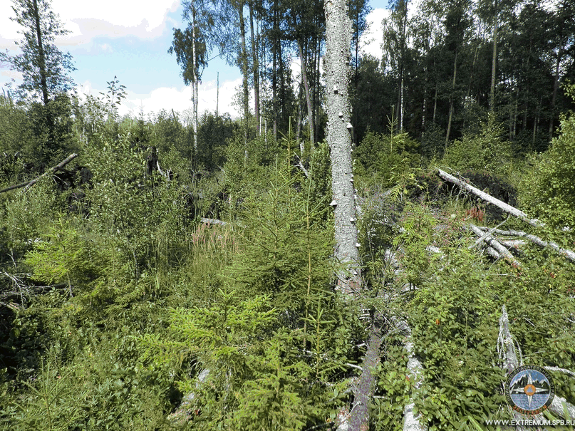 Видимый из густого леса «просвет» при ближайшем рассмотрении оказывается вырубкой, которая заросла трехметровым мелколесьем. Под ногами перекопанная тяжелой техникой земля, канавы, брошенные на месте сучья и пни.