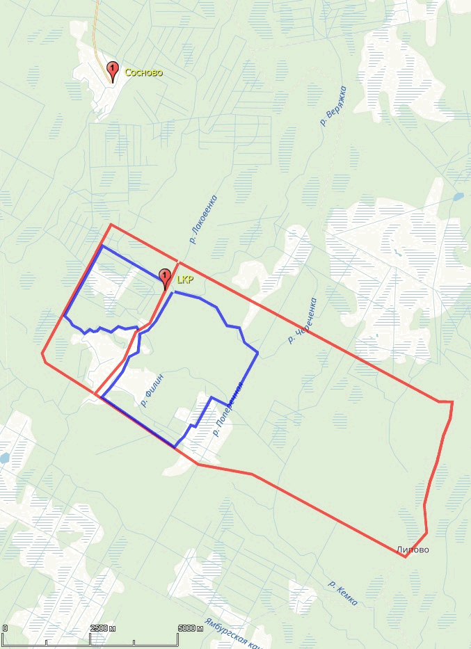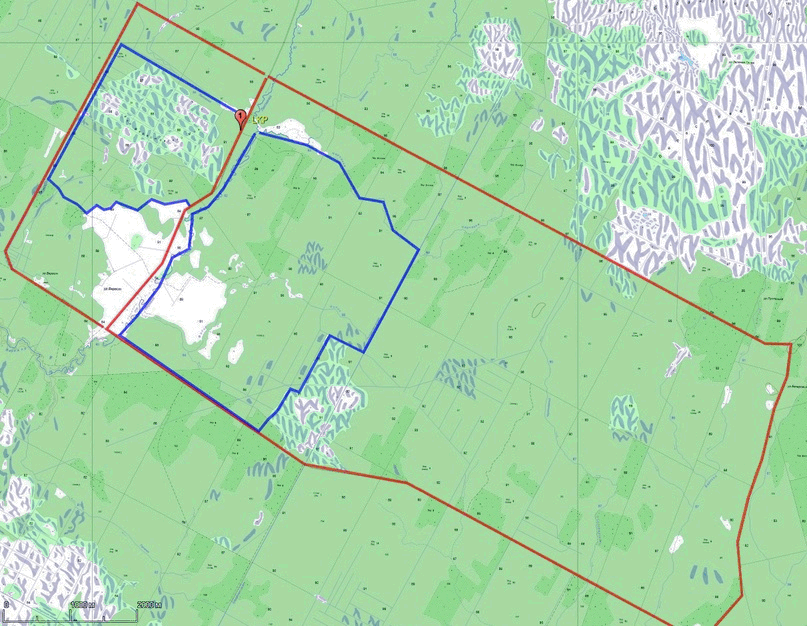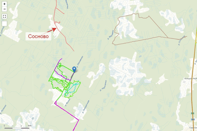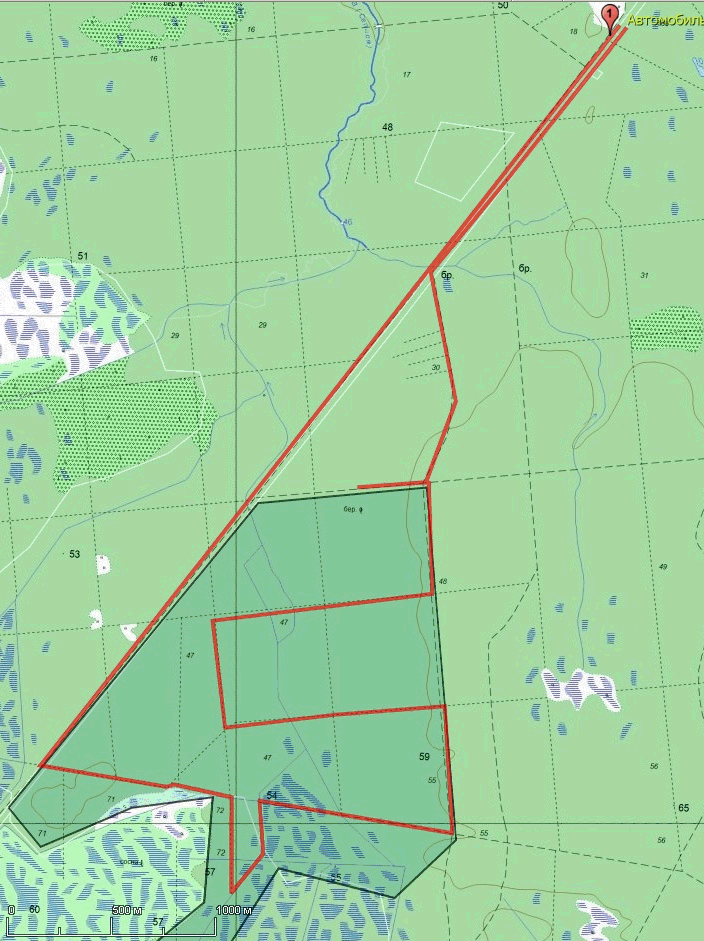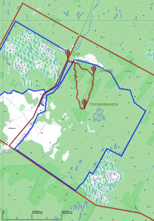 Зона ограничена с северо-запада лесовозной дорогой, с севера просекой с колеей и тропой, с востока старой лесной дорогой. С юго-запада открытым болотом, на юго-востоке естественных ориентиров нет, но там берег болота вплотную подходит к дороге. Площадь зоны составляет 2,78 км кв. К сожалению, к зоне поиска нет подъезда, так что на подход и отход пришлось заложить 5,5 км пути. Еще 8,8 км потребуется для тщательной проработки зоны на отклик. Общая длина маршрута 14,3 км, что с учетом дорог вполне нормально.