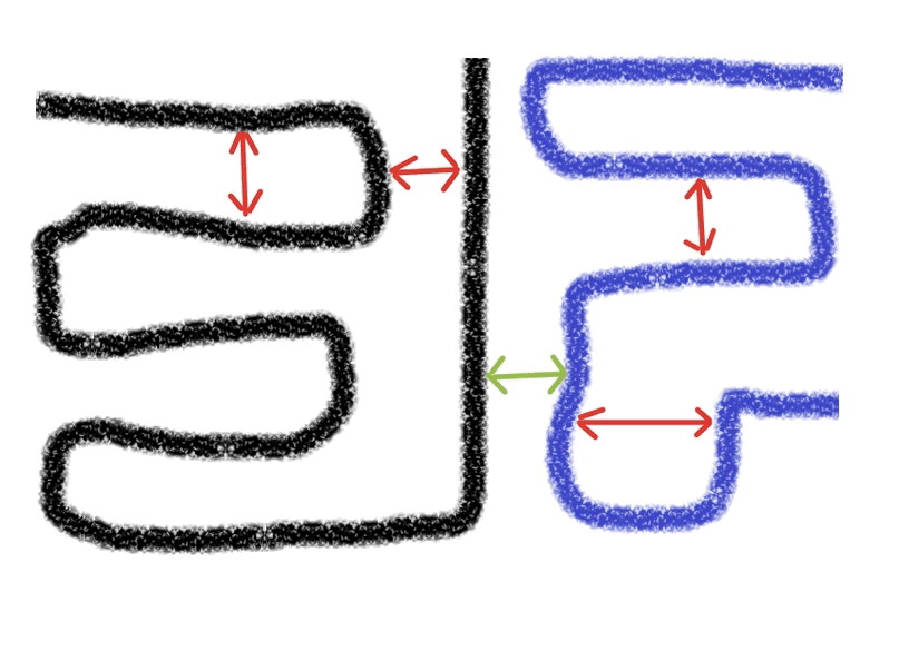 На картинке ниже черным нарисован путь первой поисковой группы (ПГ), а синим — путь второй ПГ. Рыжие стрелки — это галсы. А «зеленая» стрелка — галс, если группы работали синхронно, и не галс, если группы работали в разные дни. Разница в том, что потерявшийся мог переместиться из одного места в другое, не услышав спасателей. Поэтому лучше, если на ПСР приезжает сразу несколько групп. Это снижает риск того, что по стечению обстоятельств потерявшийся убежит от спасателей.