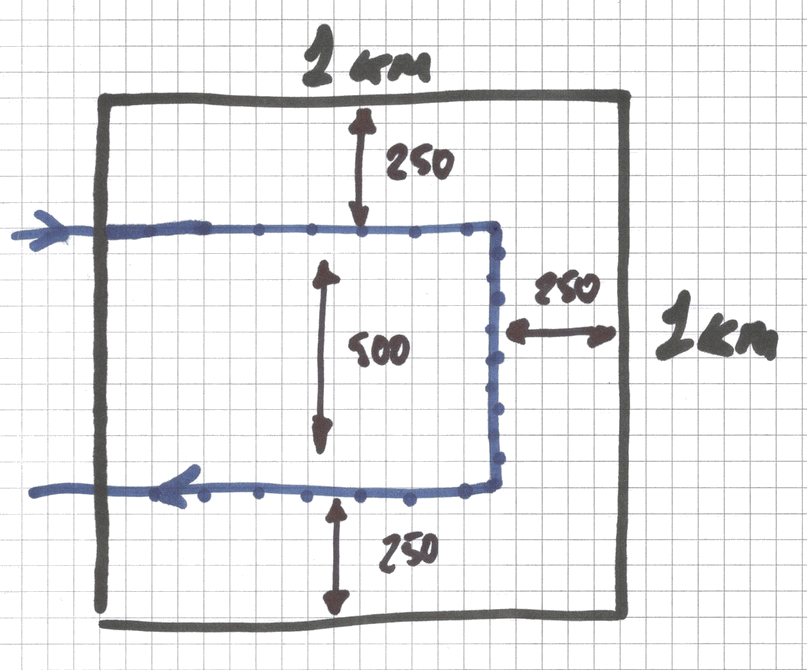 Исходя из консервативной оценки слышимости в 250 метров, мы планируем галсы в 500 метров. Грубый расчет показывает, что на 1 км кв. потребуется 2 км пути, если выбрать маршрут оптимально.