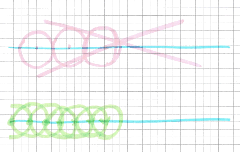 - Слишком редкая работа на отклик. Группа может двигаться по хорошей дороге или наоборот преодолевать труднопроходимую местность и ошибочно оценить момент, когда пора снова кричать и слушать. Чтобы надежно прокричать район, надо кричать и слушать каждые 200-250 метров. Достаточно несколько раз пропустить нужную точку, чтобы в зоне поиска остались «дырки» (см. рисунок ниже). Избежать этого помогает простановка метки на навигаторе в той точке, откуда группа работала на отклик;
