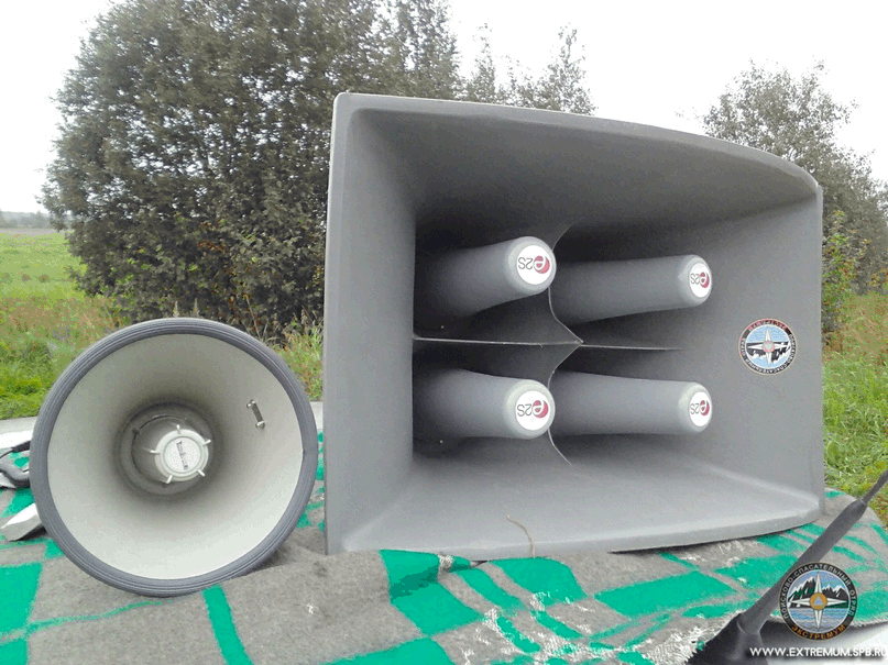 У нас в эксплуатации кроме легких мегафонов и гудков, которые используются при работе на отклик, есть два вида звуковых маяков: средние и большие. И те, и другие были спроектированы для работы на море и в карьерах и дают крайне мощный звук. Средние пробивают около 5 км леса, а большие — до 8 км. Все сирены состоят из собственно сирены, блока управления и аккумуляторов. Блок управления позволяет автоматически подавать сигналы по таймеру, несколько секунд с последующим перерывом. Аккумуляторов хватает на 6-8 часов такой работы.
