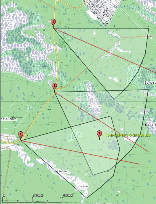 Ниже пример такого сценария «по мотивам» реальных ПСР. Предварительная локализация «восточнее дороги 41К, южнее массива садоводств». Первый «залп» из точки (1) на юго-восток-восток. Потерявшийся то ли слышит, то ли нет. Направление определить не может. Второй сигнал из точки два на юго-восток. Потерявшийся слышит сирену лучше, примерно определил направление. Третий сигнал из точки (3) на юго-восток-восток. Потерявшийся снова слышит сигнал, причем левее предыдущего. Определена примерная локализация. Группа ушла с дороги в лес, еще один сигнал подтвердил локализацию, и потерявшийся был найден на отклик.