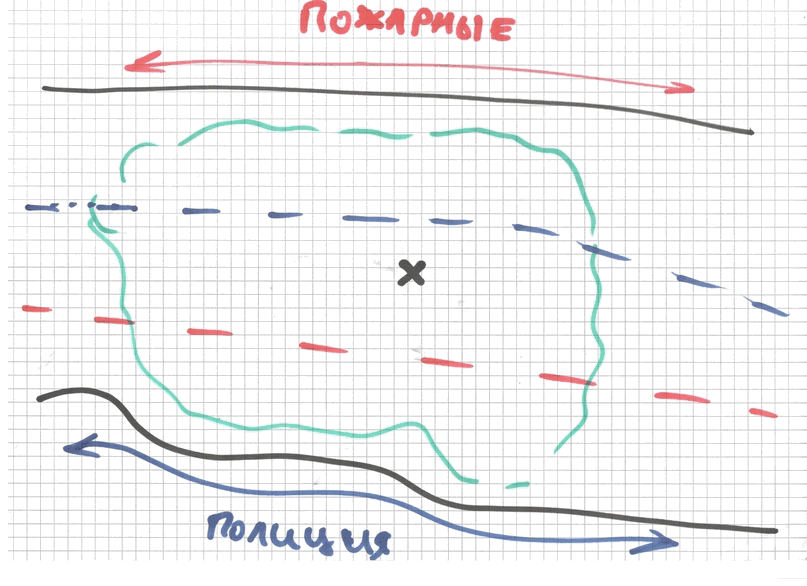 Неправильное использование сирен. Красная сплошная — движение пожарных, красная пунктирная — слышимость пожарной сирены. Синим то же самое для полиции.