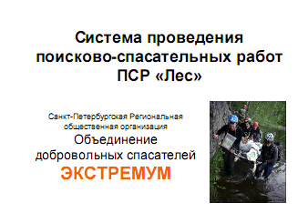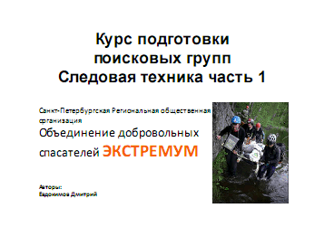 1. Обзор системы поисково-спасательных работ спасотряда ЭКСТРЕМУМ 2. Общий курс поиск людей в природной среде 3. Лекция 1 курса СЛЕДОПЫТ материалы доступны только для авторизованных пользователей