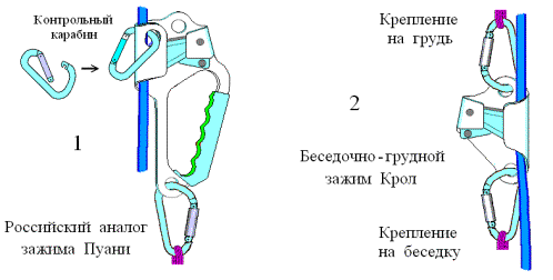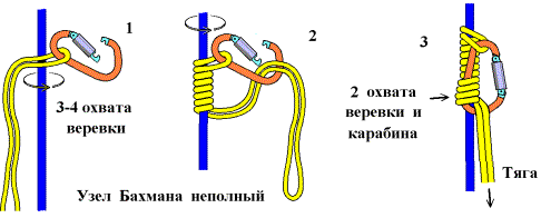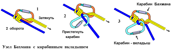 2. Страховочная веревка пристегивается к промежуточным точкам карабинами с муфтами, посредством крючьевых оттяжек (см. раздел Снаряжение).