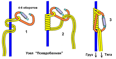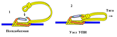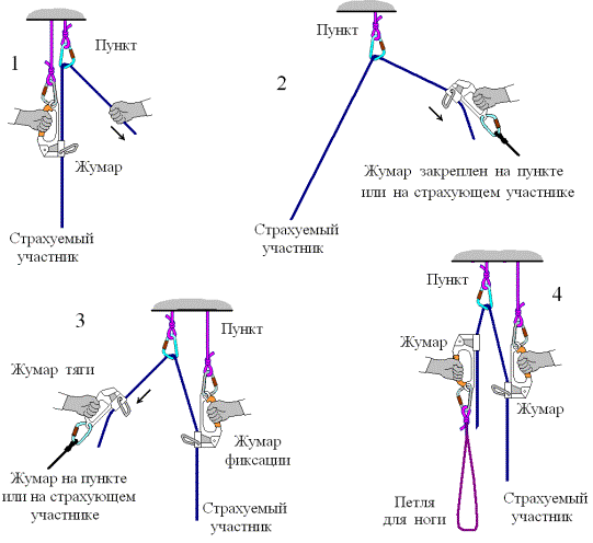 2.. Груз может транспортироваться на отдельном блоке или карабине, ниже участника, пристегнутый к его беседке отрезком веревки 1-1,5м.