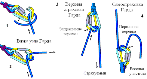 3. При страховке беседочной восьмеркой, до прохождения страхуемым участником первого промежуточного крюка, страховочная веревка должна проходить через карабин пункта, расположенный выше уровня восьмерки и на расстоянии от нее не менее 0,5м. Страхующий участник должен быть обеспечен самостраховкой и контрсамостраховкой.
