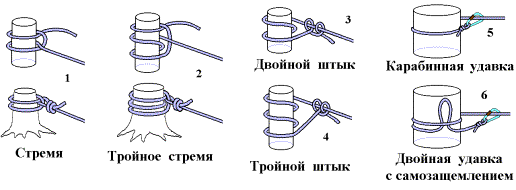 На опоре, на которой из-за большого трения, возможности заклинивания веревки и по др. причинам, нежелательно применять карабинную удавку, на ней применяется петельный сбрасыватель (см. Снаряжение). При переправе основной группы и грузов сбрасыватель блокируется карабином.