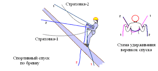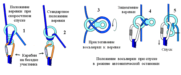 Допускается спуск участников на восьмерке или др. устройстве по, параллельной к переправе, свободно висящей веревке. При этом, карабин короткой самостраховки участник пристегивает к переправе.