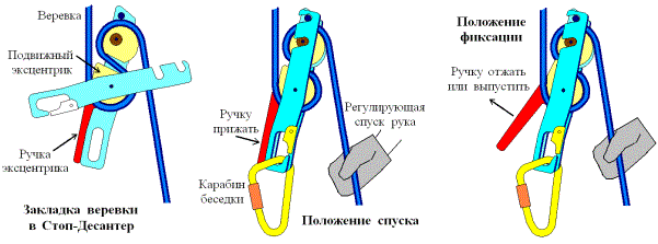 При недостаточном усилии веревка начинает проскальзывать в руках. При этом скорость проскальзывания может увеличиваться, оставаться постоянной или замедляться, но натяжение веревки будет оставаться примерно одинаковым, равным усилию участника. Для разных участников сила проскальзывания различно. Зависит оно и от страховочных рукавиц. В кожаных оно на 20-25% больше, чем в брезентовых.