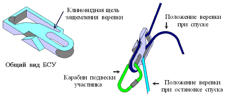 Б) Спуск участника с грузом. Груз подвешивается под участником, на его беседке, на коротком, 30-40см отрезке веревки. Груз имеет 30-40см удлинитель с карабином или блоком. Спуск происходит на спусковом устройстве с автофиксацией, как в 3.7.2.А или с верхней страховкой, как в 3.7.2.Б.