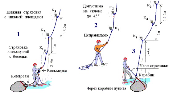 1. При страховке через карабин нижнего пункта его охват страховочной веревкой должен составлять не менее 135О (угол страховки < 45О). Суммарный охват верхнего и нижнего карабинов должен быть не менее 270О.