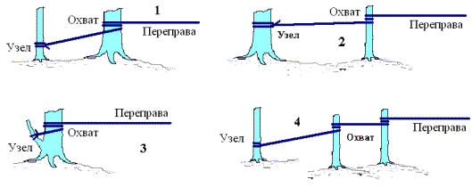 3. Техника натяжения и снятия переправы как для выше описанной, горизонтальной переправы.