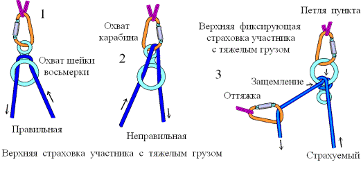 3. При страховке восьмеркой нижнего пункта участника с грузом веревка должна охватывать шейку восьмерки.