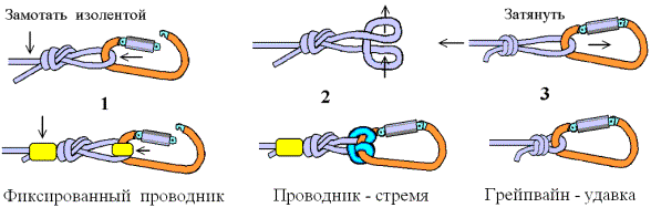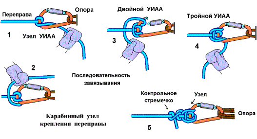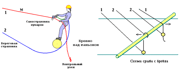 Следует отметить, что крепление на веревке переправы веревки спуска карабинной удавкой неприемлем, так как при ее стягивании снизу веревка переправы подрезается. Для исключения этого на навесной переправе подвешивается скользящий, заглушенный, судейский карабин. Если переправа представляет металлический трос, то карабин не требуется.