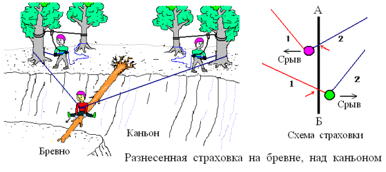 2. Двухстороннюю страховку, когда страховка обеспечивается с двух сторон, из начального и конечного пунктов траверса, через промежуточные точки. В этом случае участник, по мере движения, отстегивает страховочную веревку целевого пункта от проходимых промежуточных точек и пристегивает страховочную веревку исходного пункта на эти точки.