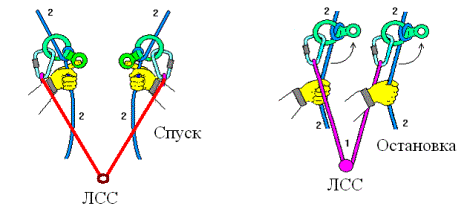 2*. Участники спускаются на восьмерке или др. устройстве по, параллельной к переправе, свободно висящей веревке, судейской или командной. При этом, карабин его короткой самостраховки пристегивается к переправе.