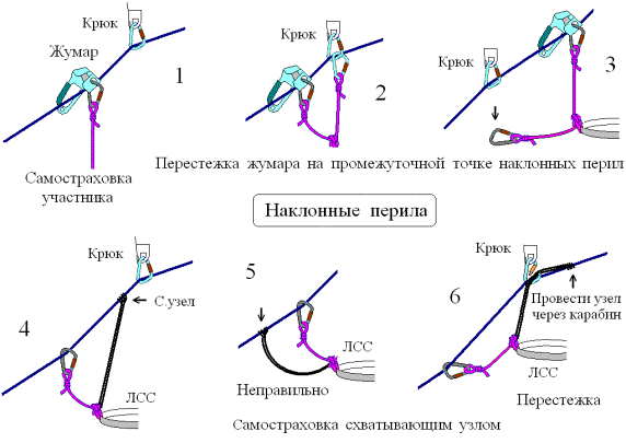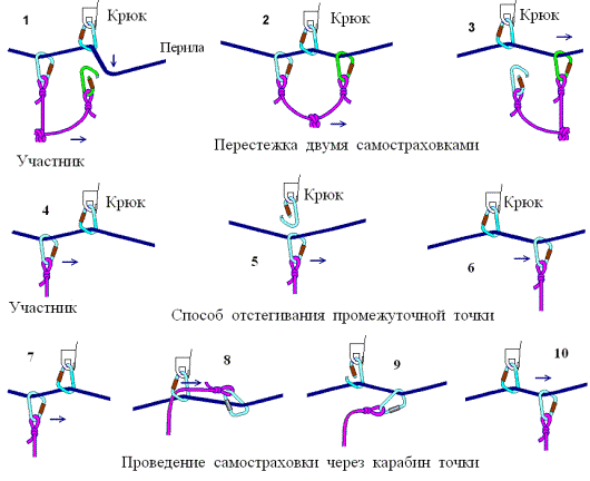 Если при движении по этим перилам требуются специальные средства опоры, аналогичные манипуляции производятся и с ними. Ниже даны последовательности перестежек в наиболее сложных ситуациях: