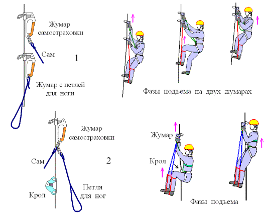 При пересадке с навесной переправы на вертикальную веревку подъема участник пристегивается к ней жумаром короткой самостраховки. Ниже к веревке пристегивает второй жумар с опорной петлей для ноги. С помощью этих жумаров участник поднимается по веревке, расслабляет переправу и отстегивается от нее. |