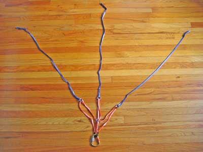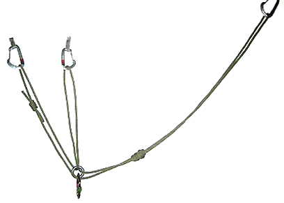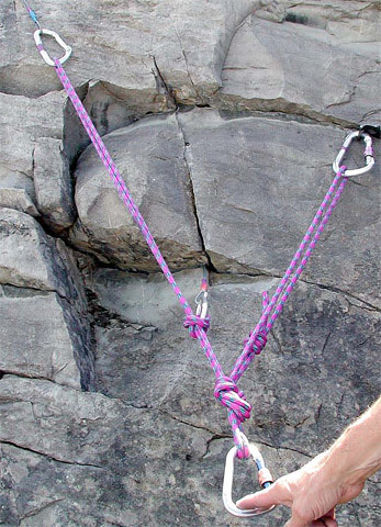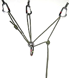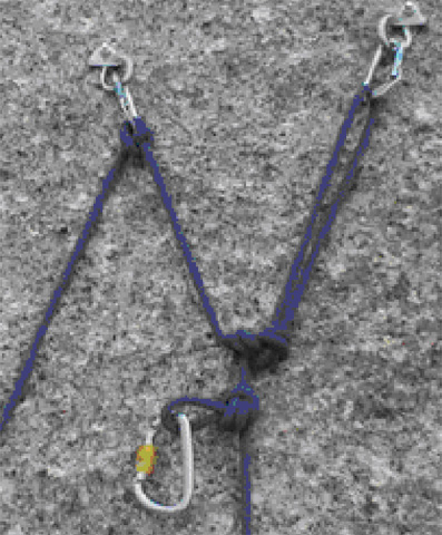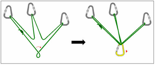 Правая точка - крюк, присоединенный длинной петлей, продетой через узел центрального пункта, чтобы избежать нагрузки карабина по трем направлениям. Петля укорочена узлом, чтобы лучше уравнять нагрузки на все точки станции. Станция подходит для верхней страховки. При нижней, работать будет только одна из двух нижних точек.
