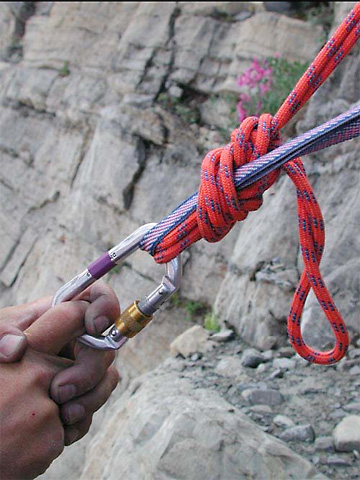 Если Вы все-таки забыли это сделать и хотите все-таки получить два отдельных пункта, вы можете использовать так называемую «полку», как показано на рис. 7. Отделите одну прядь петли и вшелкните карабин в оставшиеся. Карабин, присоединенный к полке может нагружаться неправильно, поэтому не используйте его для страховки напарника.