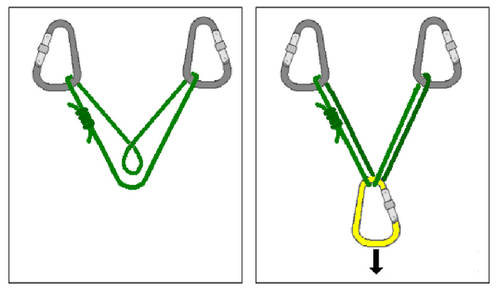 Это - быстрое и простое решение, если ваши две точки являются надежными и вы исключаете возможность нагрузки карабина по трем направлениям. Для предотвращения таких ситуаций, объедините две петли одним общим узлом, как показано на рис. 20.