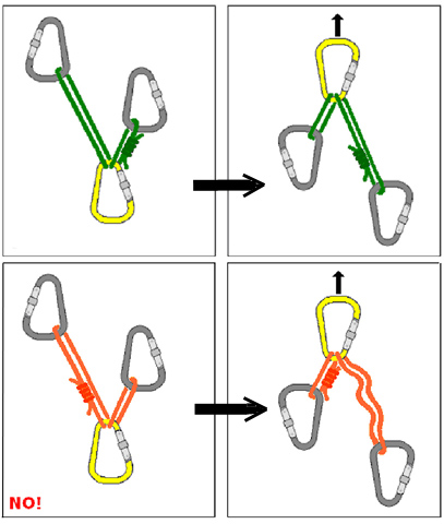 Поскольку здесь используются карабины без муфт, защелки карабинов в центральном пункте должны быть расположены напротив друг друга. Мы присоединяем свою самостраховку и готовимся принимать партнера только при условии, что мы уверены, что нагрузка будет направлена под правильным углом. Если это не так, мы должны исправить ситуацию перед тем, как двигаться дальше.