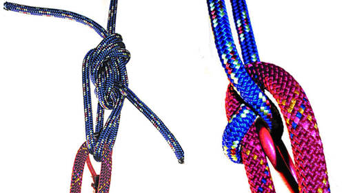 В 2006 году в лаборатории фирмы Black Diamond проводились испытания различных способов связывания слингов [3]. Испытывались 17-мм нейлоновые, 10- и 8- мм стропы из Dynex и 6-мм стропы из Дайнемы, связанные в различных комбинациях узлами «удавка», «прямой» и «узел клаймера» [4].