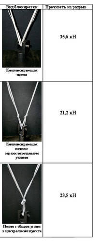Таблица 1. Результаты статических тестов. Относительная прочность связанных строп.